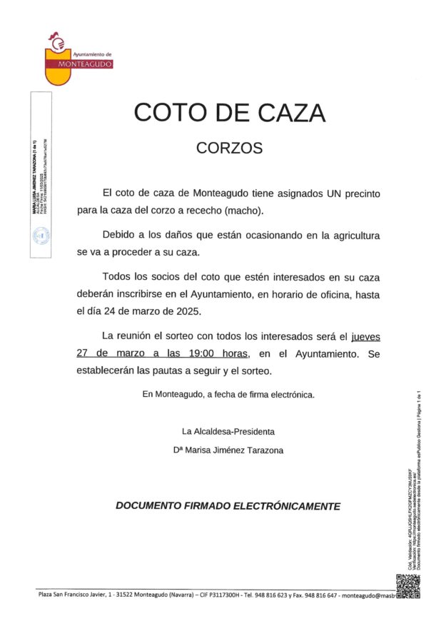 El coto de caza de Monteagudo tiene asignado UN precinto para la caza del corzo a rececho (macho). Debido a los daños que están ocasionando en la agricultura se va a proceder a su caza. Todos los socios del coto que estén interesados en su caza deberán inscribirse en el Ayuntamiento, en horario de oficina,…