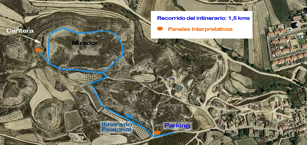 Como primera actuación se ha configurado un itinerario interpretativo de 1,5 km de distancia, que permite poder ser recorrido sin ninguna complejidad y donde el visitante podrá conocer gracias a dos paneles interpretativos cómo era este territorio hace 19 millones y el tipo de animales que lo ocupaba. El sendero además está pensado para que el visitante pueda apreciar el frente de cantera utilizado en la primera mitad del S.XX (1900-1950), y que deparó la aparición de algunos de estos fósiles. Su recorrido, además, permitirá contemplar una de las mejores vistas que existen desde Monteagudo, desde la que podremos apreciar buena parte del valle del Queiles y del Ebro. El sendero está balizado para señalizar su recorrido. Así mismo cuenta con una zona de aparcamiento para vehículos.