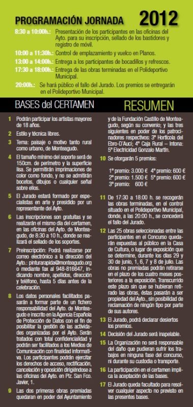 7.- Preinscripción: se abre un periodo de preinscripción con el fin de prever la celebración del concurso. La preinscripción podrá realizarse por correo electrónico a la dirección del Ayuntamiento (pinturarapida@monteagudo.org) o mediante fax al nº 948 816 647, indicando nombre, apellidos, dirección y teléfono, hasta 5 días antes de la celebración de la prueba. La preinscripción es voluntaria y orientativa para la organización, no siendo requisito obligatorio para la inscripción. La inscripción se hará por los participantes el día del certamen (hayan hecho o no preinscripción).